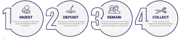 The graphic below illustrates the four key stages of drug incorporation into hair, showing how substances move from the bloodstream into the growing hair and remain locked into the structure over time.